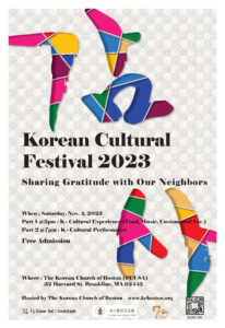 The Korean Church of Boston is celebrating its 70th anniversary this year and has been organizing and hosting various events. The Korean Cultural Festival will be the culmination of this year’s program. As the oldest Korean church in the New England region, the Korean Church of Boston has been actively involved in and contributing to cultural and educational activities in Brookline and the surrounding area. This festival was organized as an opportunity to showcase of the diversity and the richness of Korean culture, as well as to give back to and show appreciation for the welcoming and caring community that the church has been blessed with over the years.  As such, this year’s festival is themed as “Sharing Gratitude with our Neighbors.” It acknowledges that the small community of the Korean Church of Boston has been able to settle and grow together in this area because of the welcome and care of the Brookline community. Through the festival, the church aims to share gratitude and promote fellowship with its neighbors.